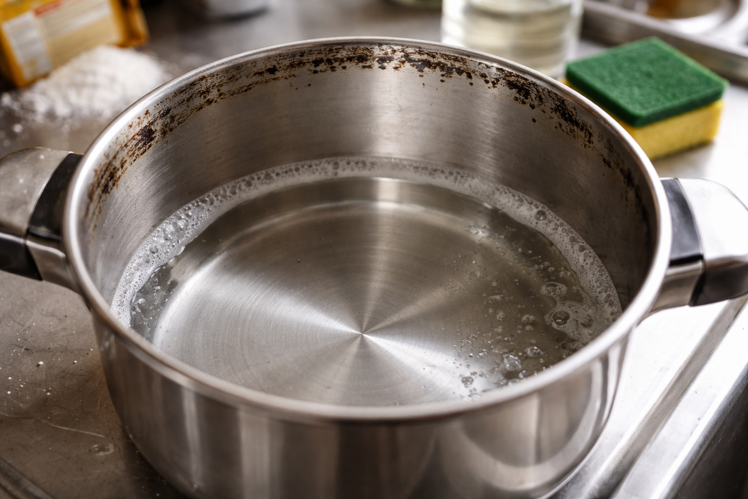 • Supilkite karštą vandenį į pažeisto indo dugną, kad jis visiškai uždengtų probleminę vietą. • Įdėkite gausius kiekius ploviklio patiekalams ir išmaišyti. • Padėkite indą ant viryklės ir užvirinkite skystį. • Nukelkite nuo ugnies, gausiai įpilkite kepimo soda ir užpilkite puse stiklinės acto. • Palaukite, kol nustos stiprus šnypštimas, ir tiesiog supilkite nešvarų skystį į kriauklę.
