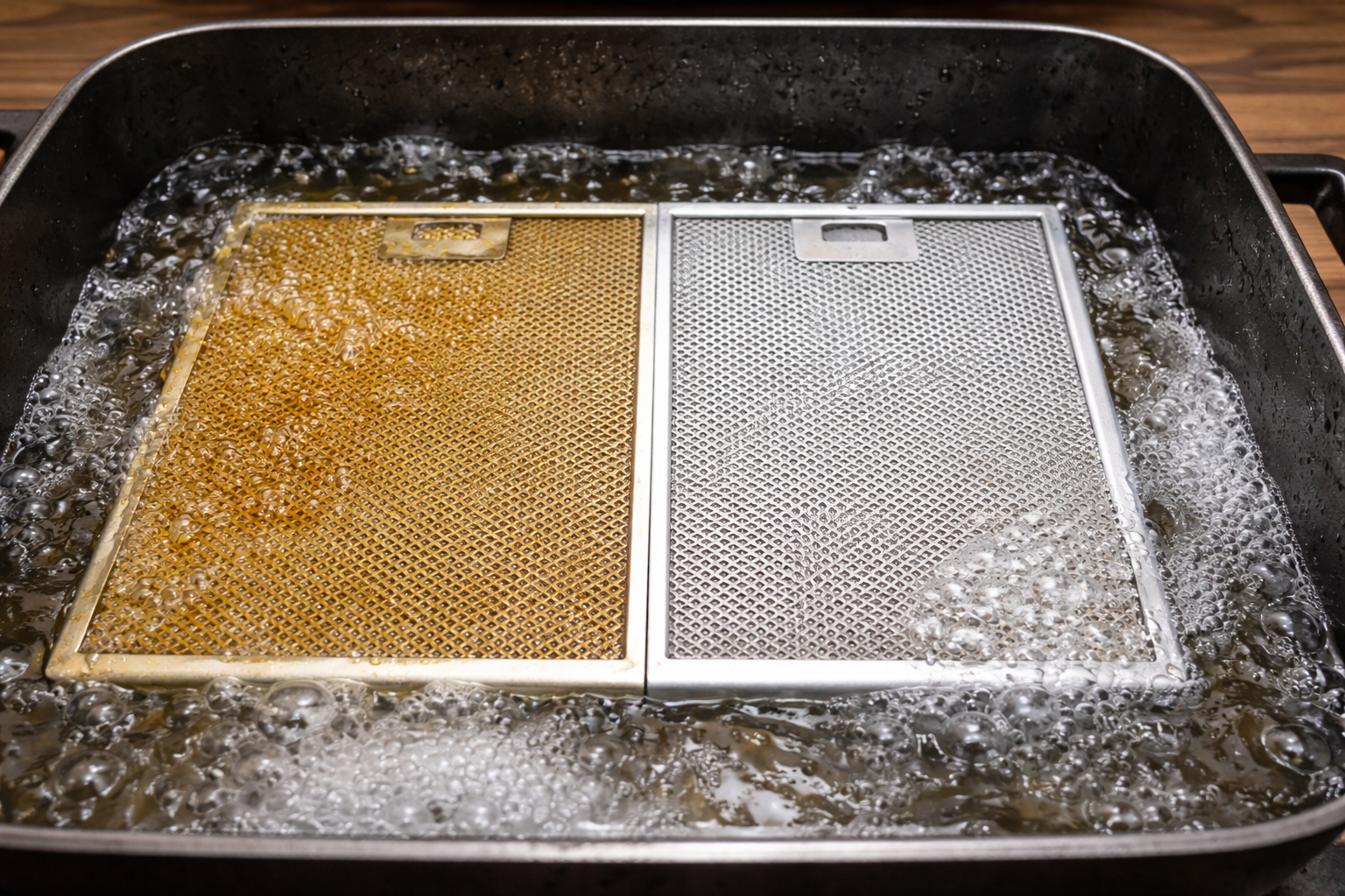 Į virtuvės gaubtas vėl spindėkite, nereikia šarminių chemikalų, nuo kurių akys ašaroja. Paslaptis slypi tinkamoje temperatūros apdorojime ir paprastame virtuvės įrankyje, kurį turi kiekvienas. Svarbiausia tinkamai pasiruošti gartraukio filtrai. Nuimkite metalinį tinklelį ir padėkite juos į gilią kepimo skardą arba dubenį.