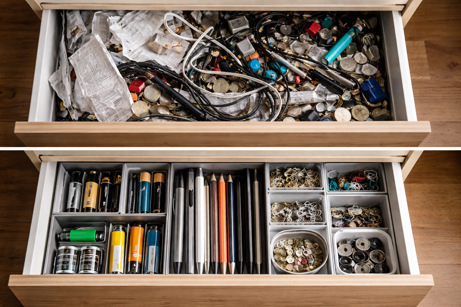 Kvitai, senos baterijos, sąvaržėlės ir ant paviršių išsibarstę mygtukai sukuria rimtą vizualinis triukšmas. Šis veiksnys tiesiogiai veikia vidinės įtampos lygį ir trukdo tinkamai pailsėti po ilgos dienos. Mūsų smegenys daugybę smulkių daiktų interpretuoja kaip nebaigtas užduotis, todėl nuolat jaučiamės pavargę net ir savo gyvenamajame kambaryje.