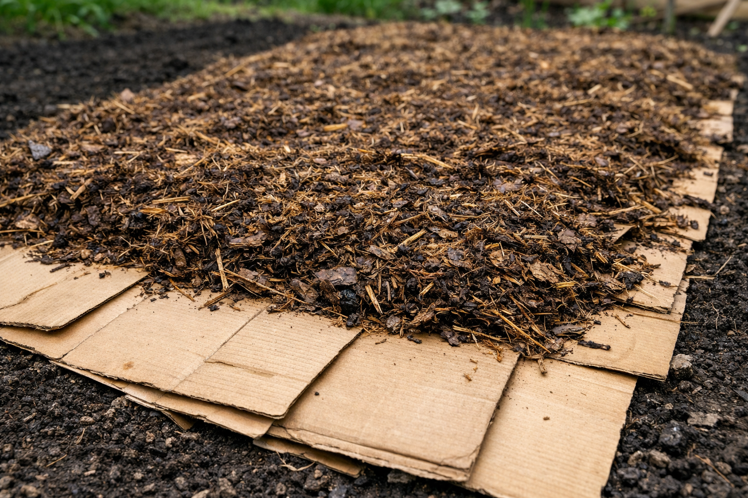 Geriau rinktis įprastą rudą gofruotą kartoną be blizgios plėvelės, kad į dirvą nepatektų cheminių junginių perteklius.