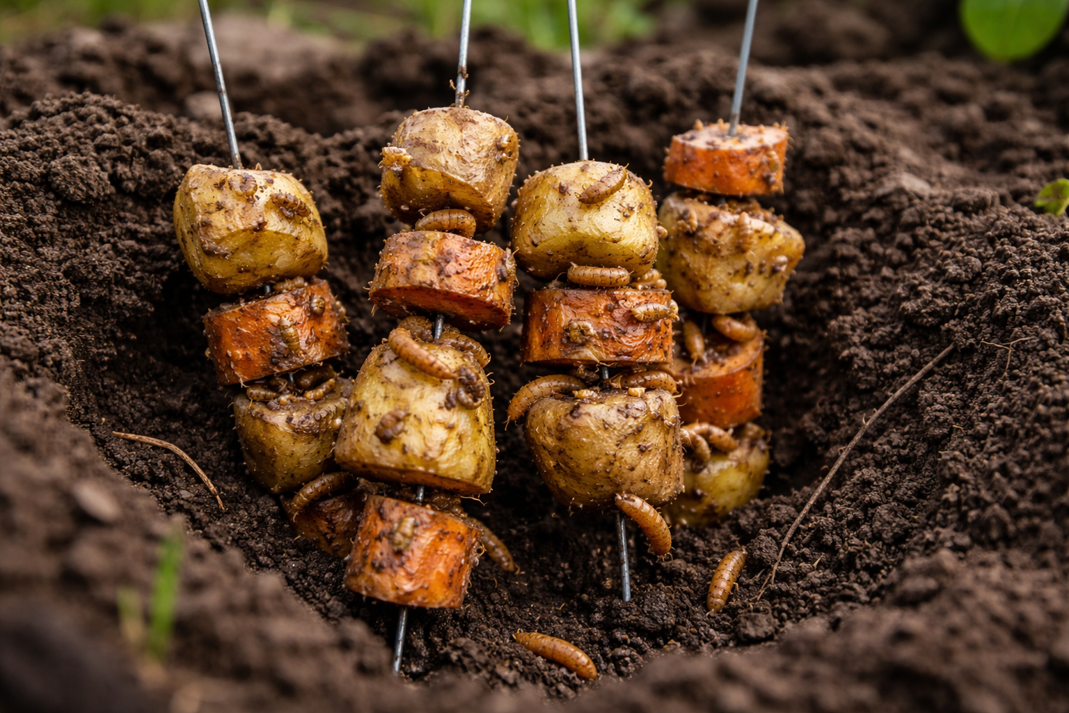 Kai tik žemė pradeda šilti, vielinis kirminas pabunda su didžiuliu apetitu. Būtent šiuo metu kenkėjas yra labiausiai pažeidžiamas, ir mes galime žaisti dėl jo maisto poreikio. Užuot laukę, kol lervos pasieks jaunus sodinukus, pamaitiname jas anksčiau.