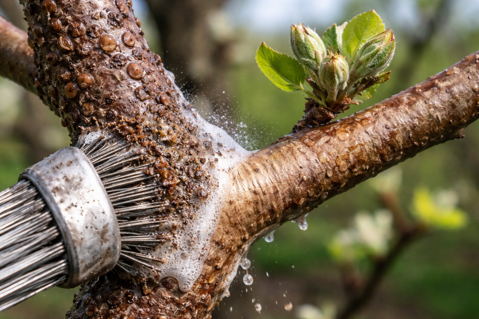 Po šiurkštaus mechaninis valymasmedžiui reikia apsaugos. Rekomenduoju naudoti preparatus mineralinių aliejų pagrindu. Jie neapnuodija kenkėjo, bet ant šakų sukuria ploną plėvelę, kuri blokuoja deguonį vabzdžiui.