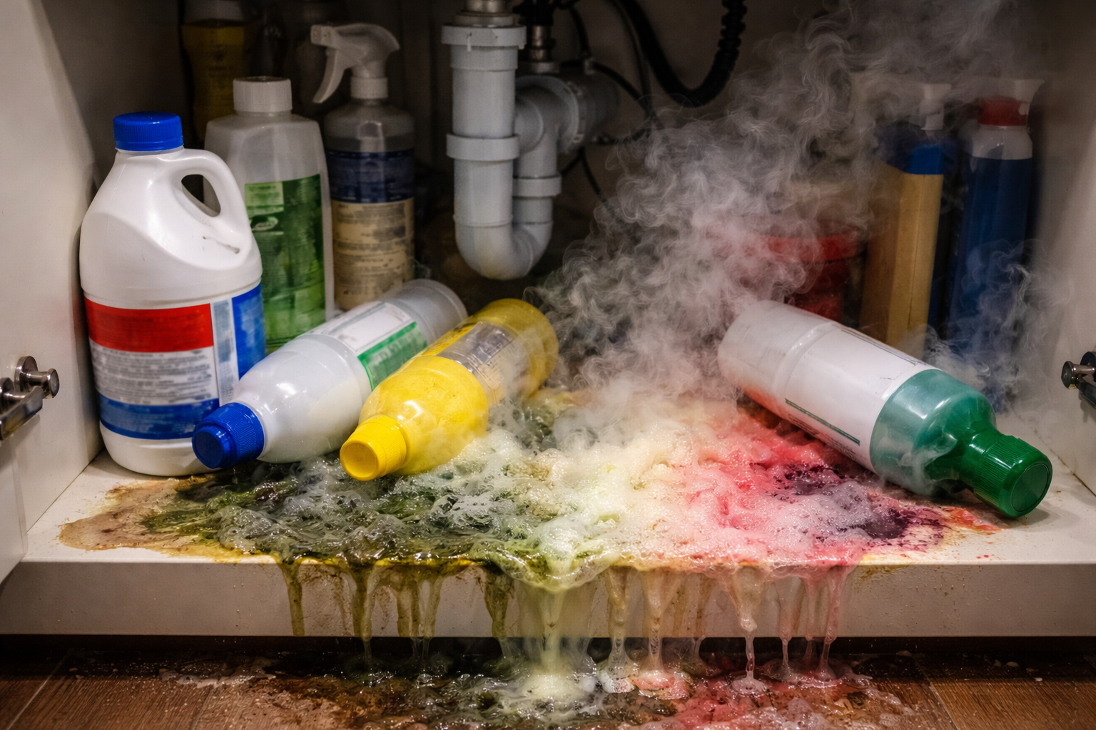 Noras greičiau nuplauti įsisenėjusią dėmę dažnai sukelia idėją sumaišyti kelis galingus junginius. Praktiškai šis nekenksmingas impulsas baigiasi sugadintu vandentiekiu, cheminiais nudegimais arba skubiu viso buto vėdinimu. Dabar aš jums pasakysiu, kurių jūsų spintoje esančių butelių visiškai negalima atidaryti tuo pačiu metu, kad valymas būtų saugus ir veiksmingas.