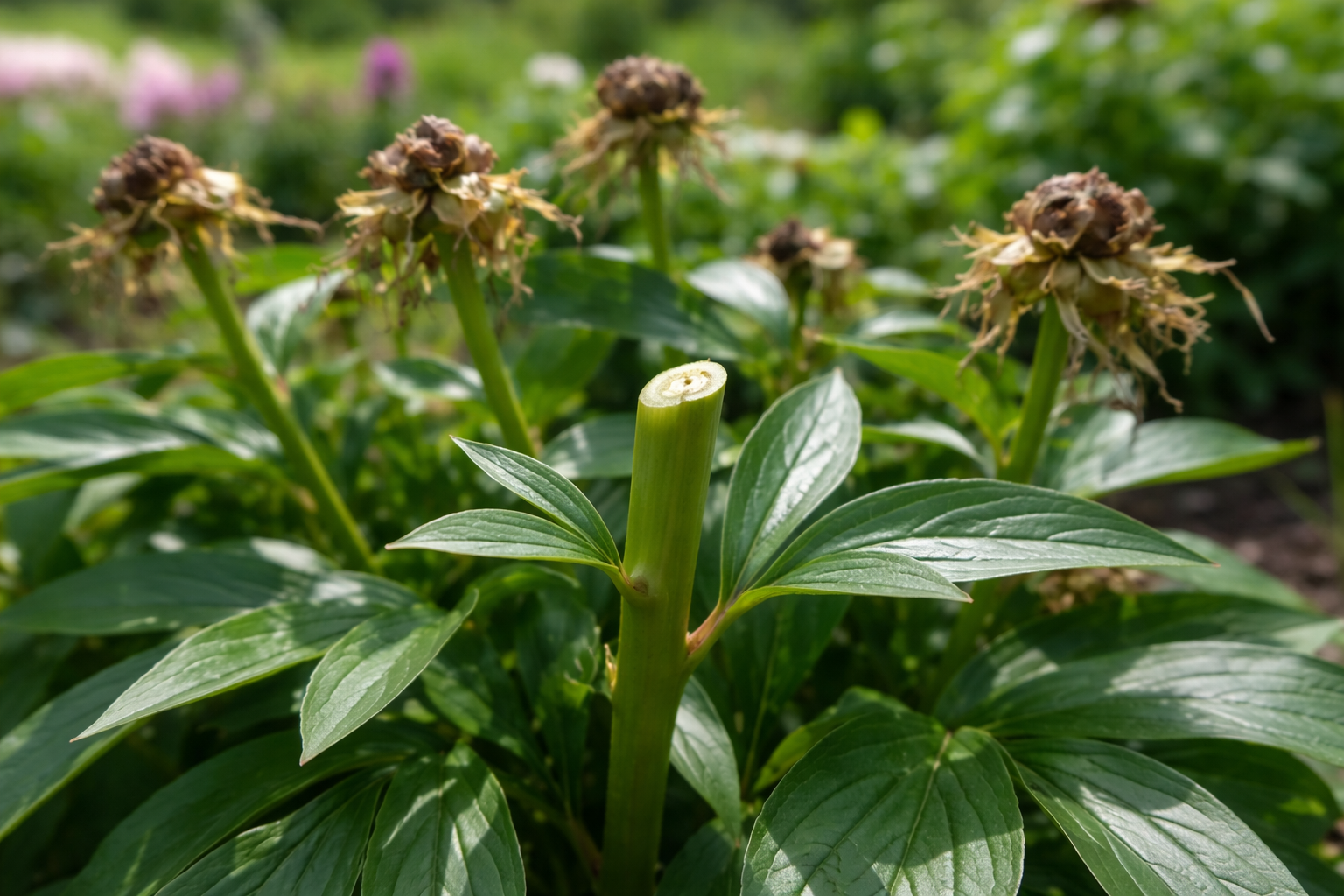 Kaip tinkamai pašalinti išblukusias galvutes • Paruoškite aštrią ir švarią sodo genėją • Po nuvytu pumpuru raskite pirmąjį didelį sveiką lapą • Padarykite tolygų įstrižą pjūvį šiek tiek virš šio lapo • Surinkite visas nupjautas dalis ir išneškite jas už gėlyno.
