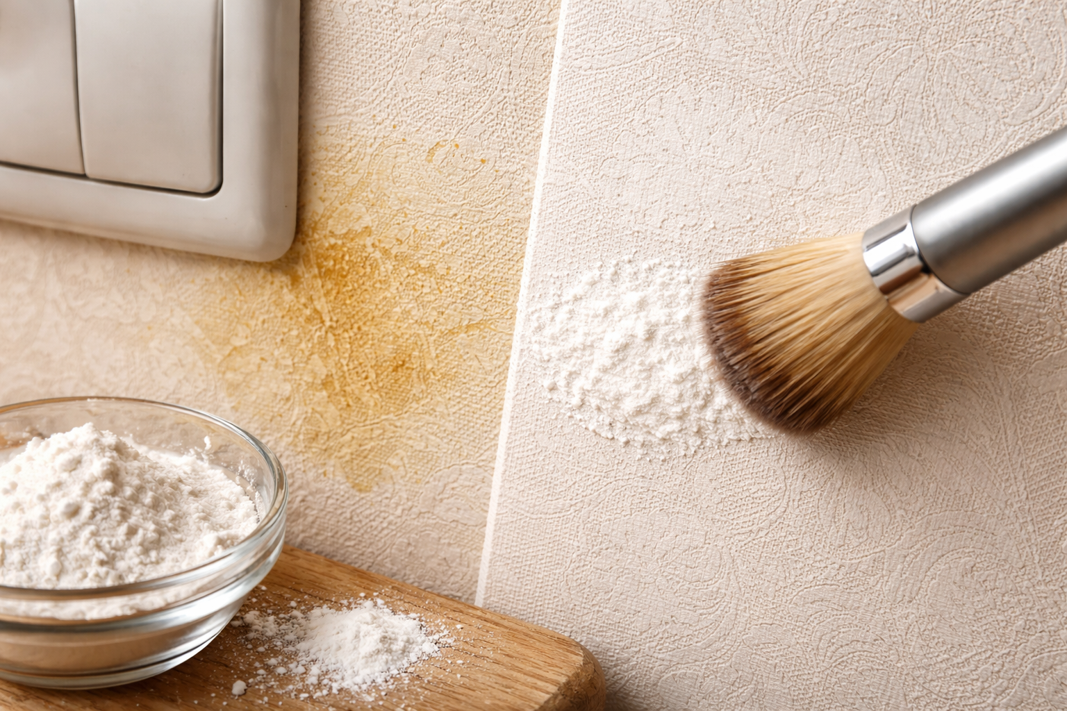 Iš karto prispauskite gabalėlį šviežios baltos duonos prie sienos, ji veiks kaip minkšta kempinė ir švelniai sugers riebumą.