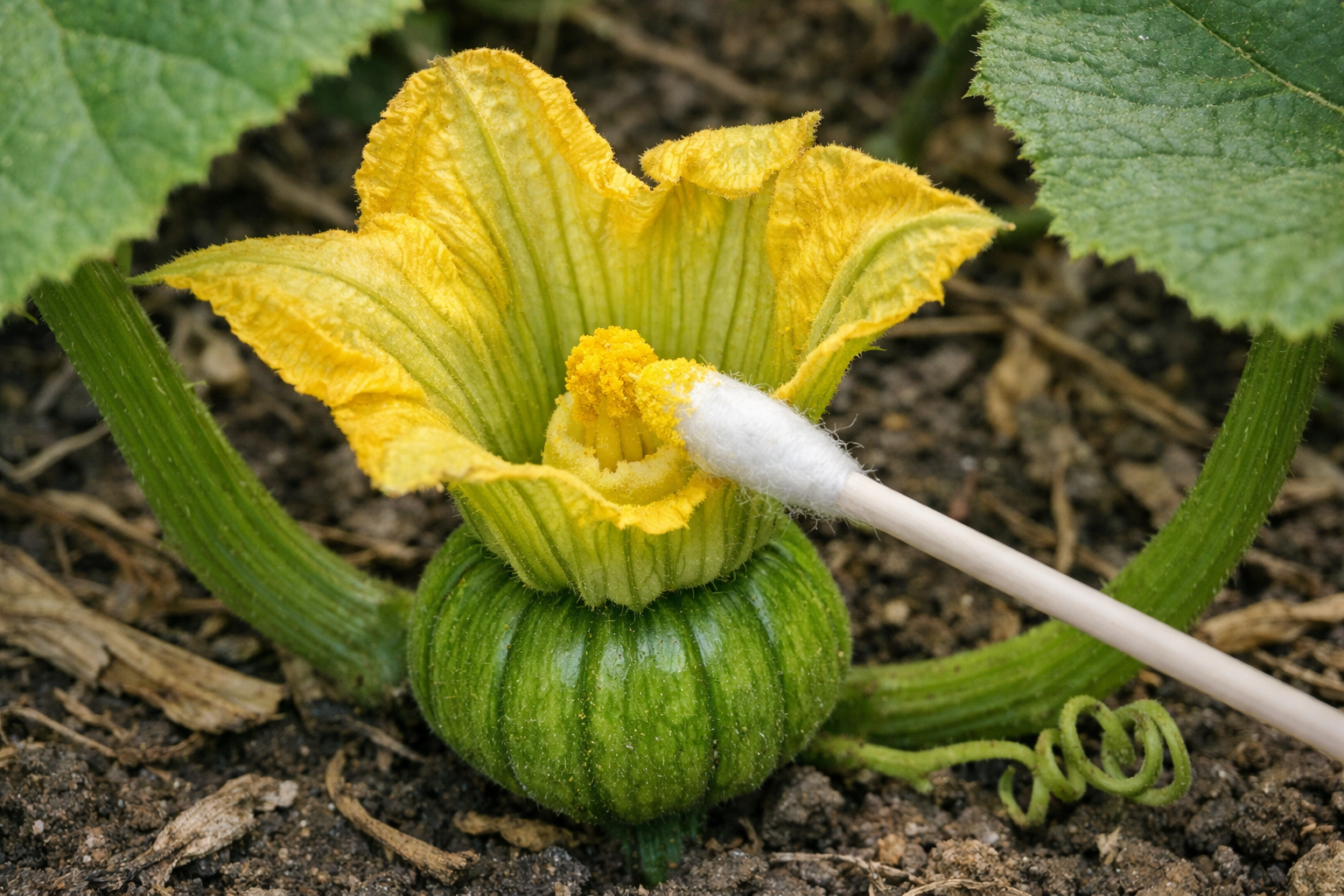 Lengvais prisilietimais perkelkite žiedadulkes į moteriškos gėlės piestelę.