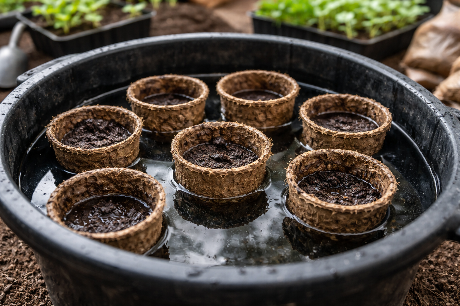 Tinkamo drėgmės lygio palaikymas yra pusė darbo. Porėtas durpių humuso struktūra turi savybę aktyviai garinti vandenį. Jei šis procesas nekontroliuojamas, molinis rutulys išdžius per kelias valandas, o tai labai svarbu jauniems ir silpniems sodinukams.