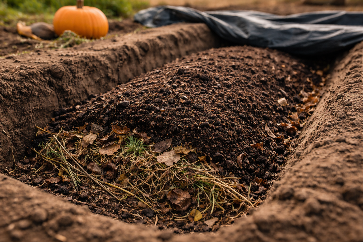 Pašalinkite viršutinį dirvožemio sluoksnį ir padėkite storą organinių medžiagų sluoksnį tranšėjos apačioje