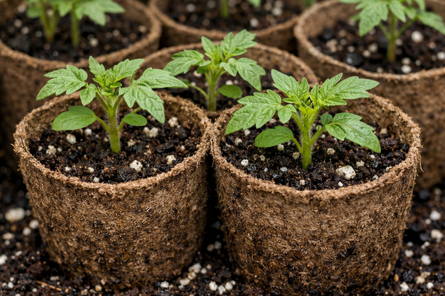 Tinkamo konteinerio pasirinkimas lemia būsimą derlių. Durpių konteineriai sukurti idealų mikroklimatą šaknims. Sienos praleidžia orą, todėl pomidorų šaknų sistema kvėpuoja ir vystosi tolygiai, nesisuka spirale išilgai plastikinio puodelio dugno.