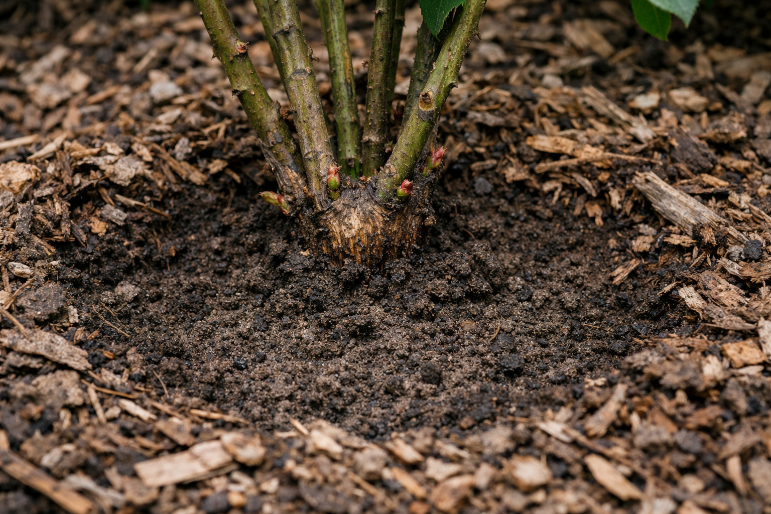 Atsargiai nugrėbkite seną mulčą nuo kamieno, kad greitai sušildytumėte šaknies kaklelį.
