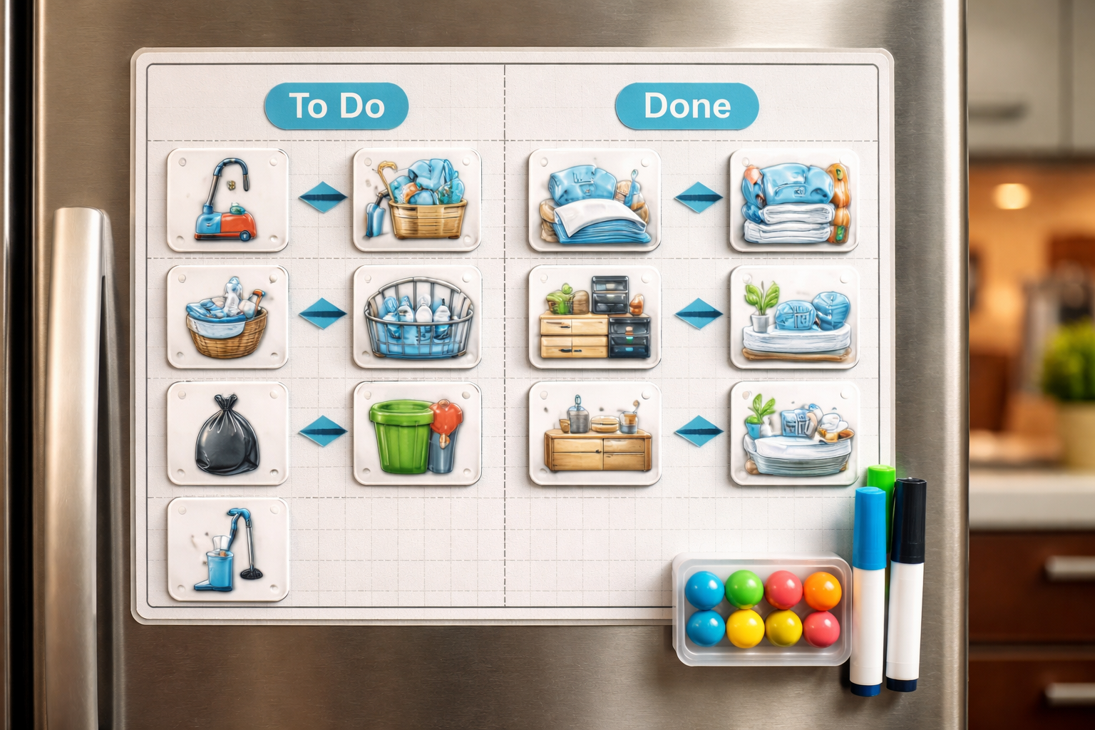 Slaptas patarimas: sukurkite vaizdinę lentą su magnetukais, kur kiekvienas šeimos narys galėtų savarankiškai pažymėti atliktas užduotis, mielai perkeldamas jas iš stulpelio „Daryti“ į stulpelį „atlikta“.