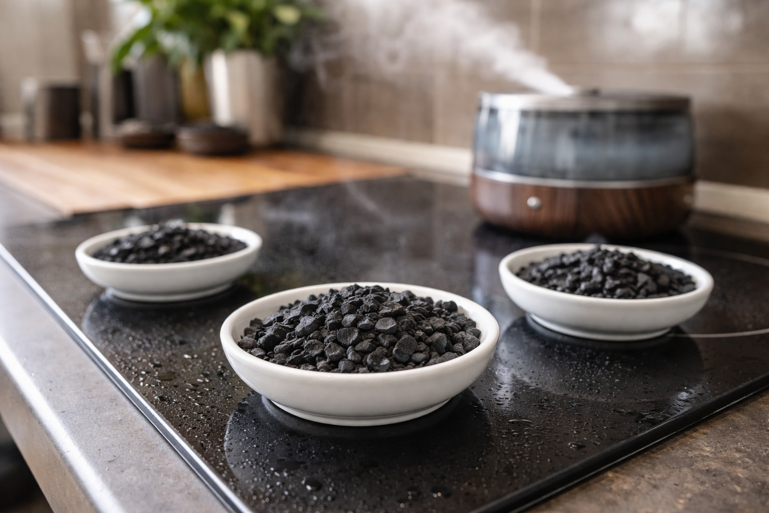 Tiems, kurie negali pakęsti acto kvapo, yra malonesnė alternatyva – kavos. Natūralūs grūdai veikia kaip galingas natūralus filtras. Pakanka sausoje, švarioje keptuvėje lengvai pakaitinti saują grūdelių, ir jų aromatas visiškai atstos nemalonius kepimo padarinius.