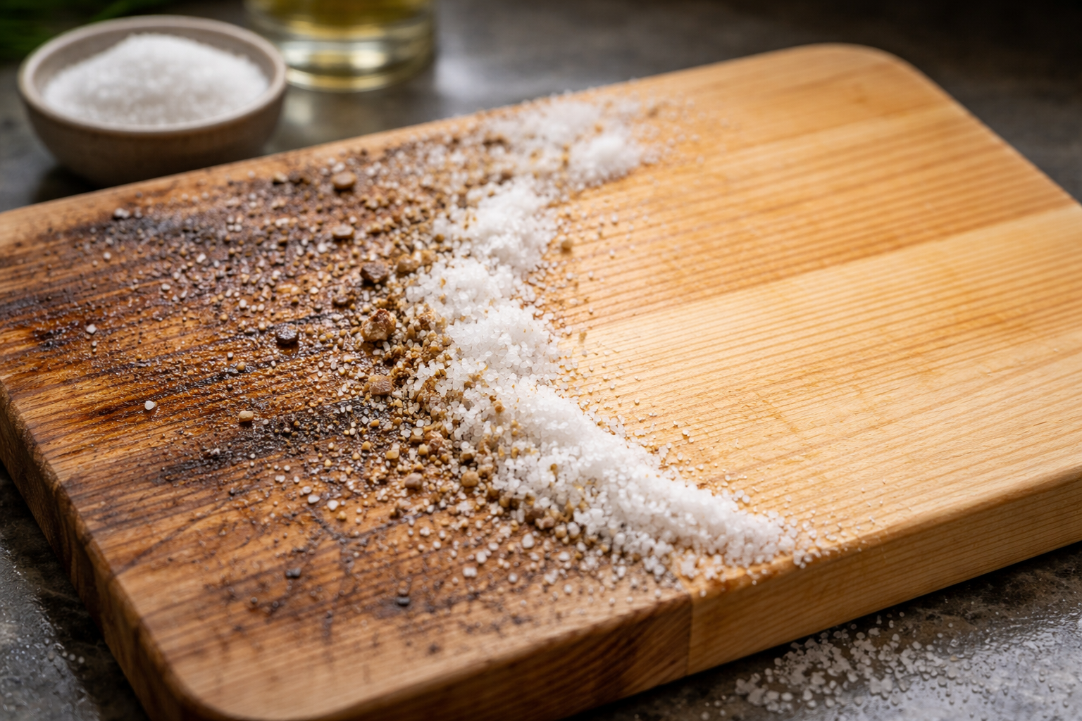 Mediena turi porėtą struktūrą. Standartiniai plovikliai nuplauna tik paviršinius riebalus, todėl mikrobai ir sultys iš maisto giliai patenka į skaidulas. Norėdami pašalinti teršalus, mums reikia natūralūs absorbentai ir maisto rūgštys.