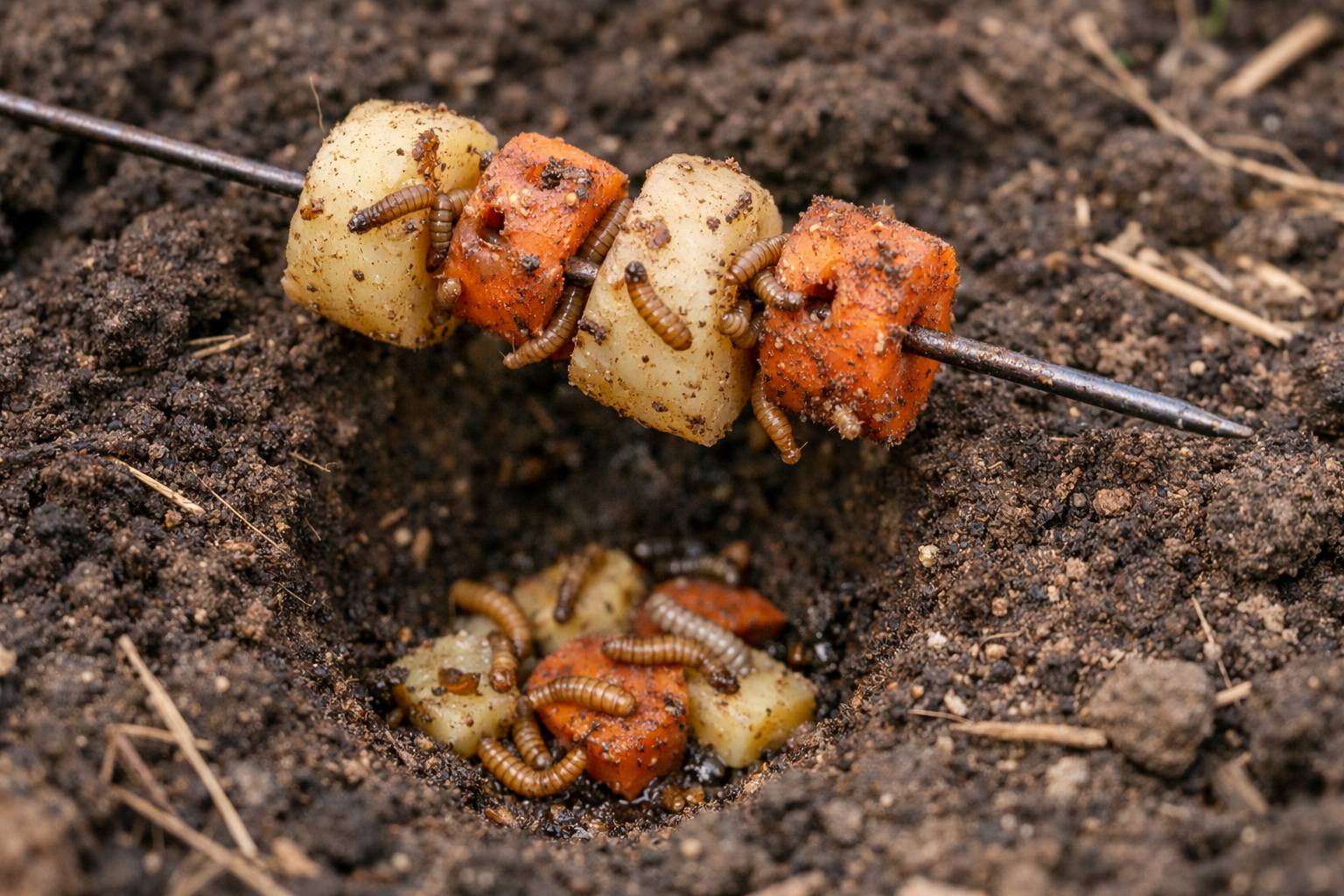 Norėdami sukurti veiksmingą spąstą, tiesiog supjaustykite senas bulves ar morkas dideliais gabalėliais. Juos reikia suverti ant vielos ir įkasti dešimties-penkiolikos centimetrų gylyje įvairiose sodo vietose.