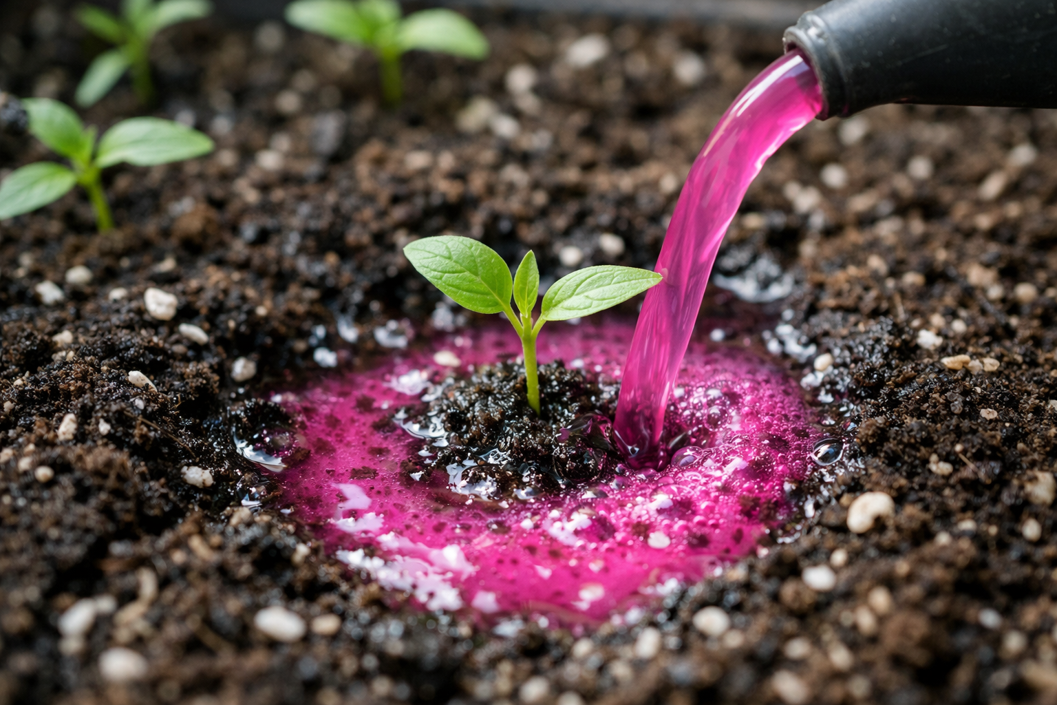 Slaptas niuansas slypi gatavo tirpalo spalvoje; jis turi būti šviesiai rausvas, skaidrus, be menkiausių neištirpusių grūdelių indo apačioje, kitaip augalas neišvengiamai gaus stiprų cheminį nudegimą.