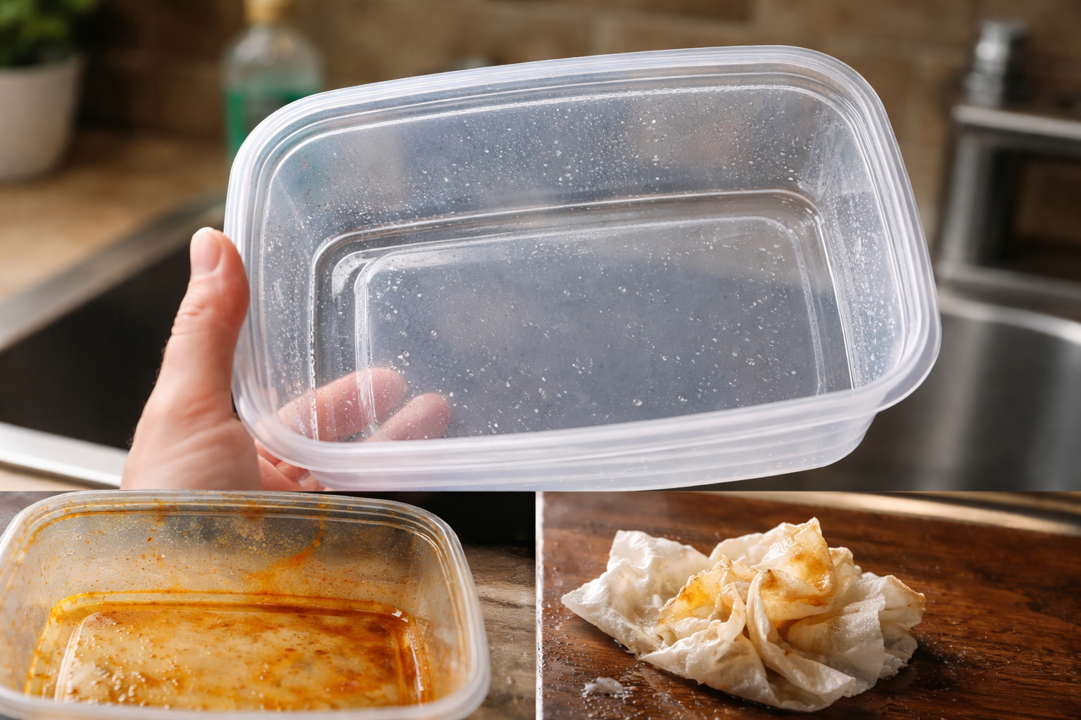 Modernus maistinio plastiko turi mikroskopines poras. Kai jie liečiasi su šiltu maistu, jie plečiasi ir tiesiogine prasme sugeria užsispyrę riebalai ir dažantys pigmentai. Kai bandome indą plauti įprasta kempine, nešvarumus tik paskirstome ant paviršiaus, neįsiskverbdami į medžiagos struktūrą.