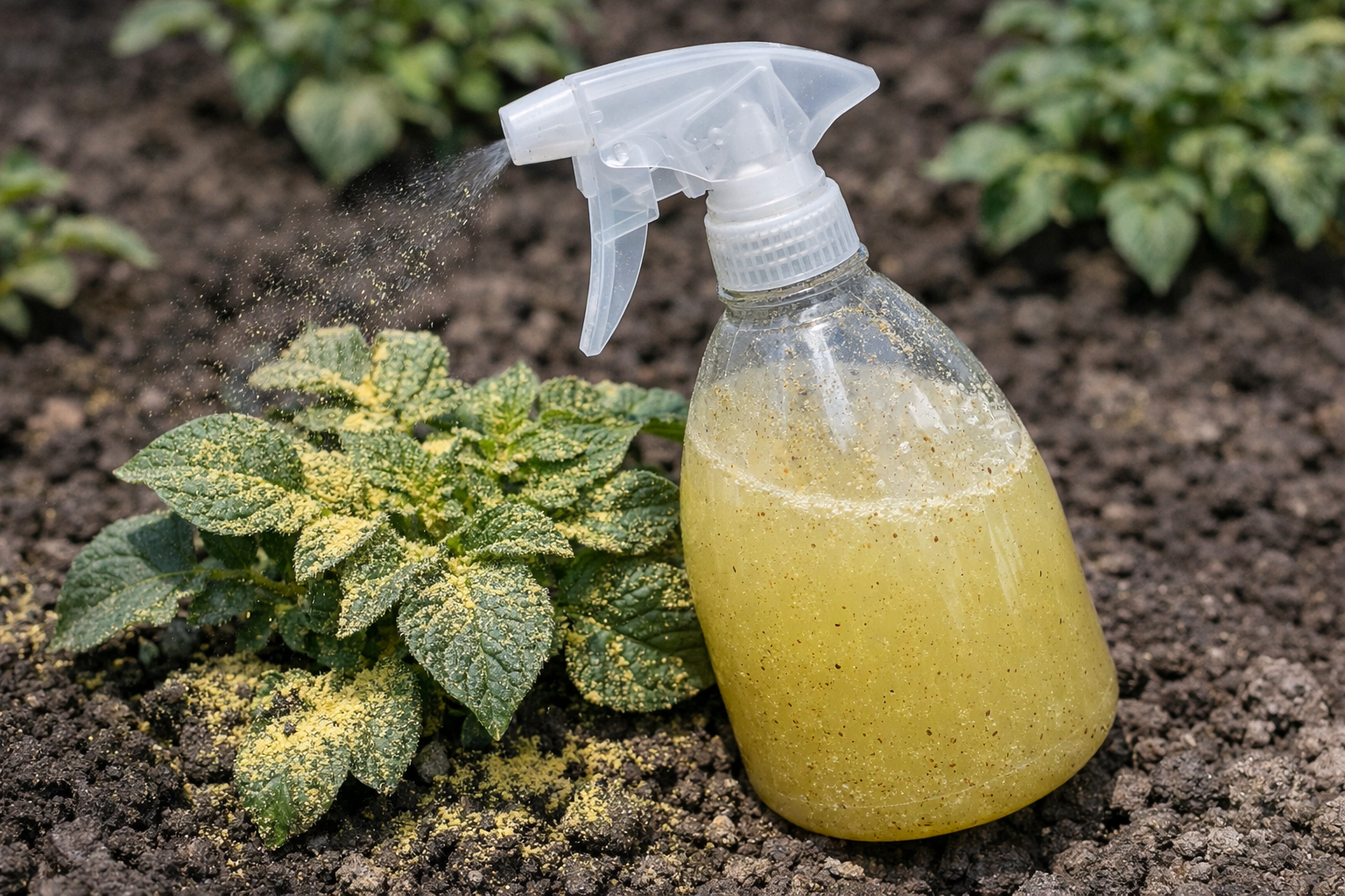 Užpiltą skystį būtinai filtruokite per storą marlę, kad mažos miltelių dalelės neužkimštų sodo purškimo antgalio.
