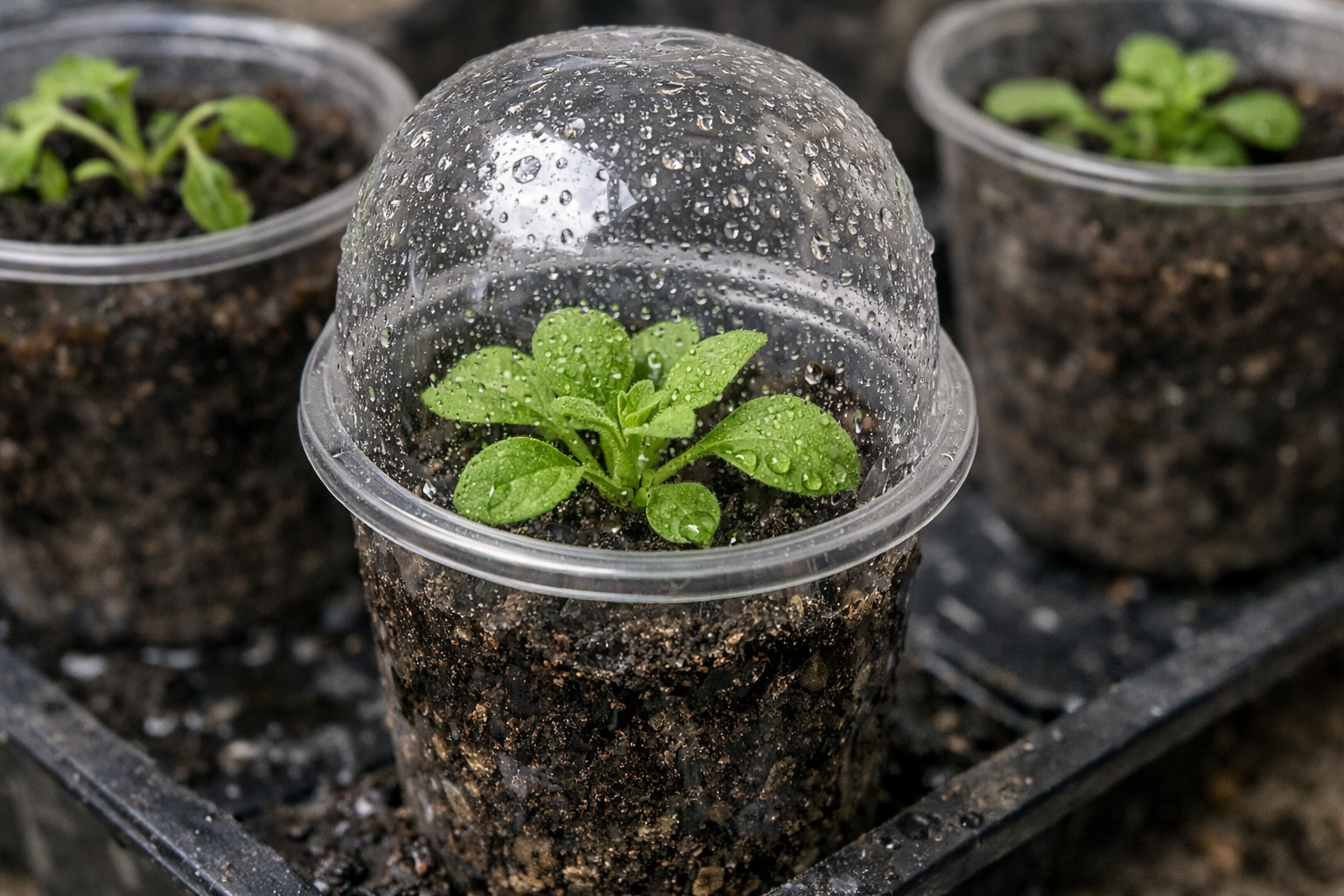 Kiekvieną daigelį uždenkite skaidriu plastikiniu dangteliu arba plėvele
