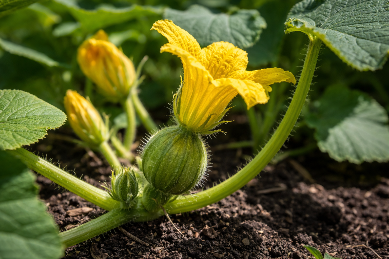 Moteriškos gėlės apačioje pastebimas vizualinis sustorėjimas mažo apvalaus moliūgo pavidalu.