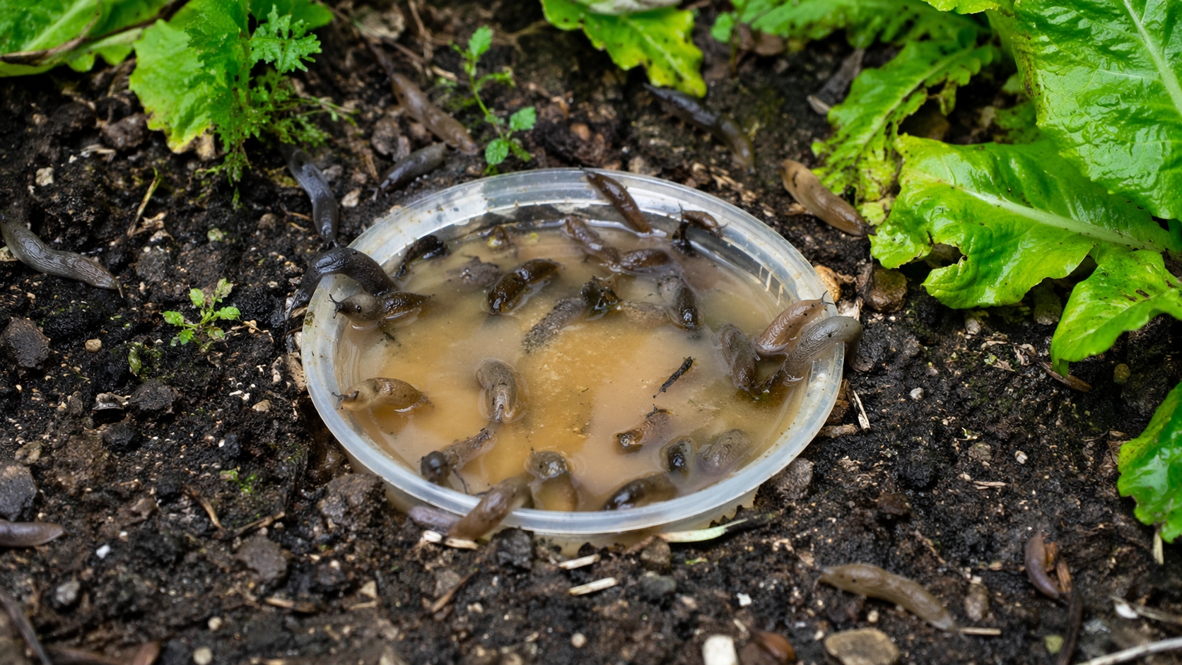 Pagrindinė paslaptis slypi konteinerio įrengimo gylyje. Puodelio kraštai turėtų išsikišti tiesiog porą centimetrų virš žemės, kitaip į vidų netyčia pateks naudingi dirviniai vabalai, kurie patys yra natūralūs šliužų priešai.