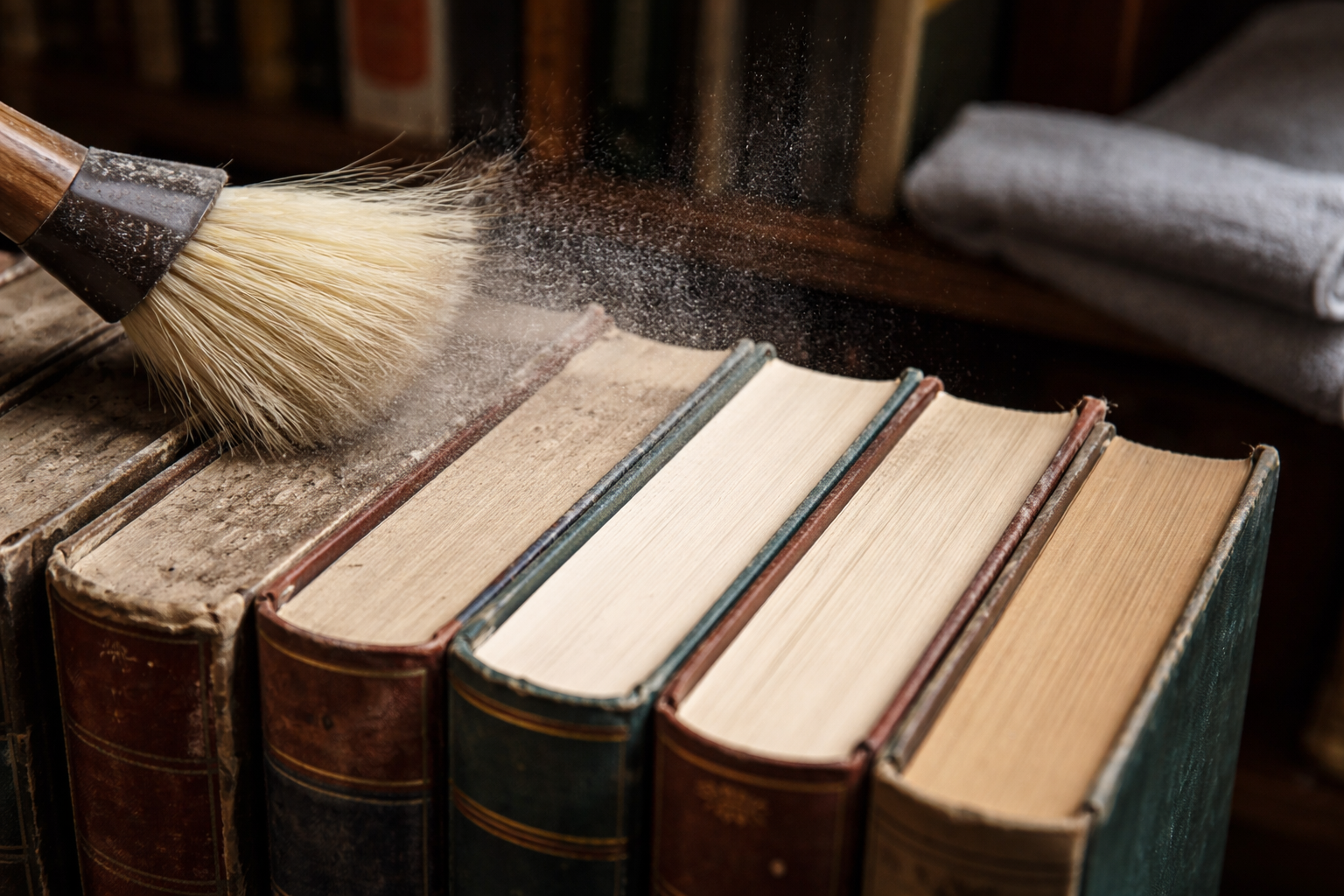 Knygų lentynos pritraukia didžiulį kiekį dulkių, kurios iš pasididžiavimo šaltinio virsta alergijos ir nemalonių kvapų šaltiniu. Per daugelį metų dirbdamas su privačiais archyvais radau kelis patikrintus būdus, kaip greitai sutvarkyti stuburus ir viršelius, visiškai atsisakant agresyvių cheminių medžiagų.