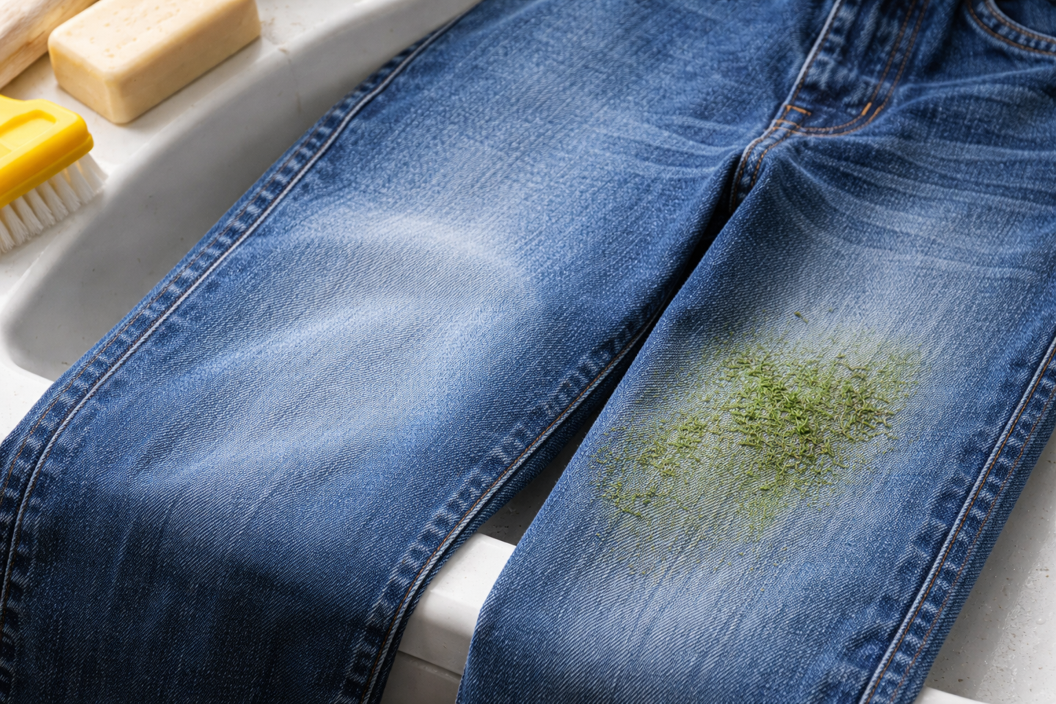 Svarbus niuansas: niekada netrinkite šviežios žolės dėmės sausu skudurėliu, nes taip kaustinis pigmentas tik giliau įstums į džinsinio siūlų struktūrą.
