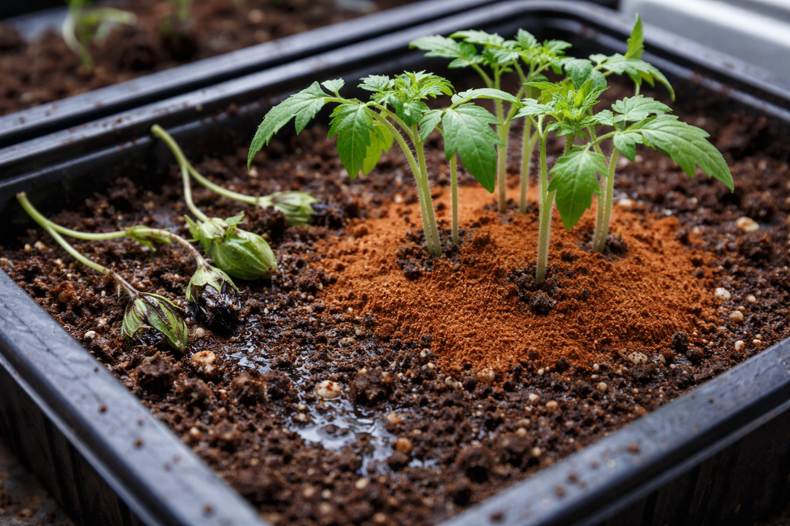 Savalaikis pažeidimo izoliavimas ir staigus substrato drėgmės sumažėjimas patikimai blokuoja sporų plitimą. Sausų birių medžiagų naudojimas apsaugo pomidoro šaknies kaklelį nuo sušlapimo ir vėlesnio puvimo.