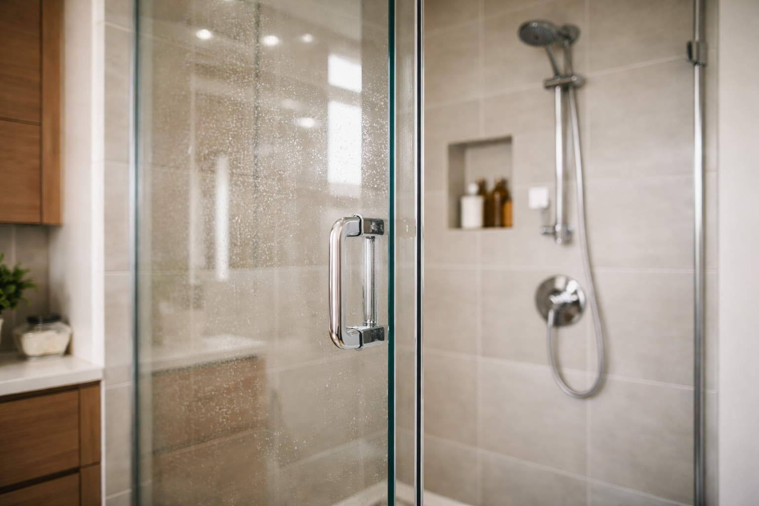 Iškart po valymo ant stiklinių dušo durelių užpurkškite švelnaus acto tirpalo.