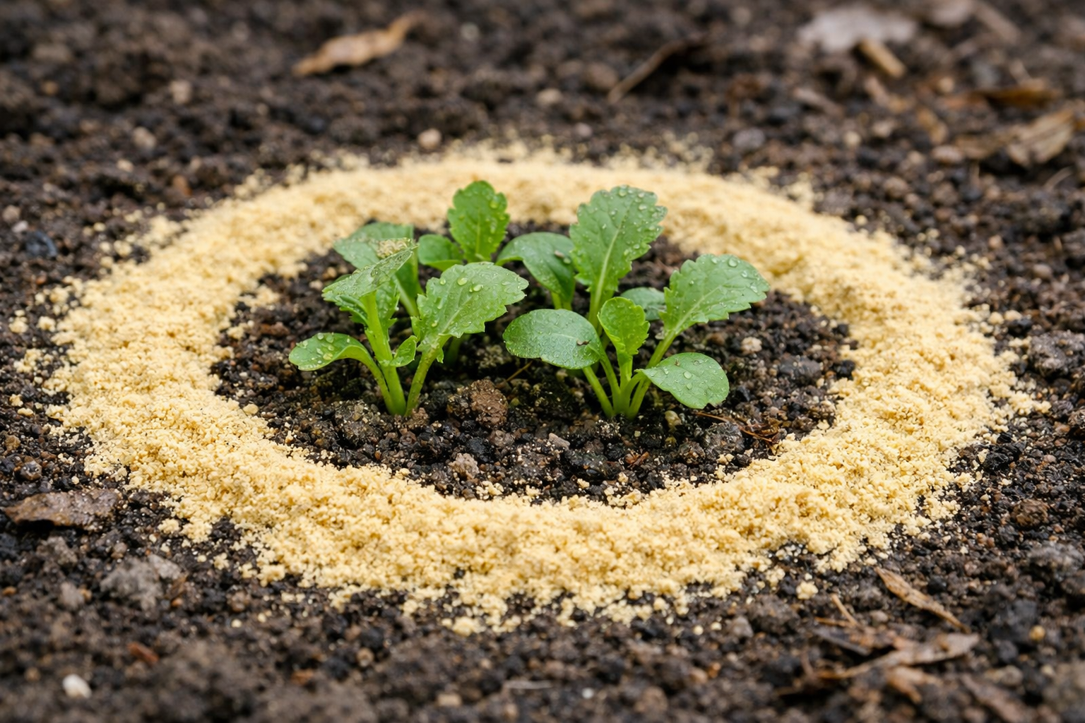 Pabarstykite sausai garstyčių milteliai lygiame maždaug penkių centimetrų pločio sluoksnyje aplink kiekvienos lovos perimetrą.
